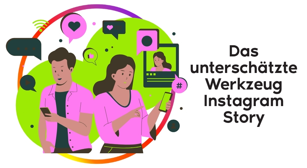 Der Titel: Instagram Story Ein unterschätztes Werkzeug für nachhaltiges Engagement und 2 Personen, die im Netz unterwegs sind.